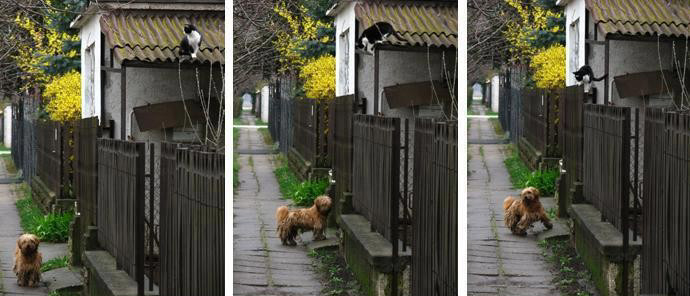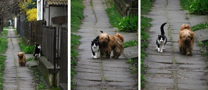 This is an article about a dog waiting for his feline friend at the same time, same spot daily without fail to go for a stroll together.