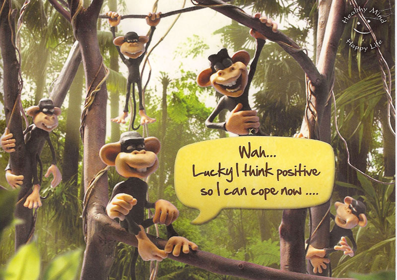 This is the front cover of positive thinking campaign post card by the Singapore Health Promotion Board.  Though the campaign was held many years back, but the post card is still sticking on my wall.  It pose as a reminder to me and the cute monkeys always made my day.