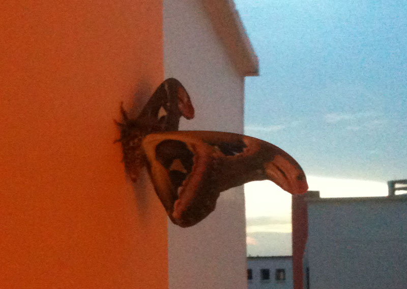I saw a moth landed on the wall outside my apartment. It’s about 10 inches in length from wing to wing and dark brown in color. I’m not sure it scientific name, a moth I could only call. I’m fast enough to take a shot of it and stood still to see what is going to happen to it next.