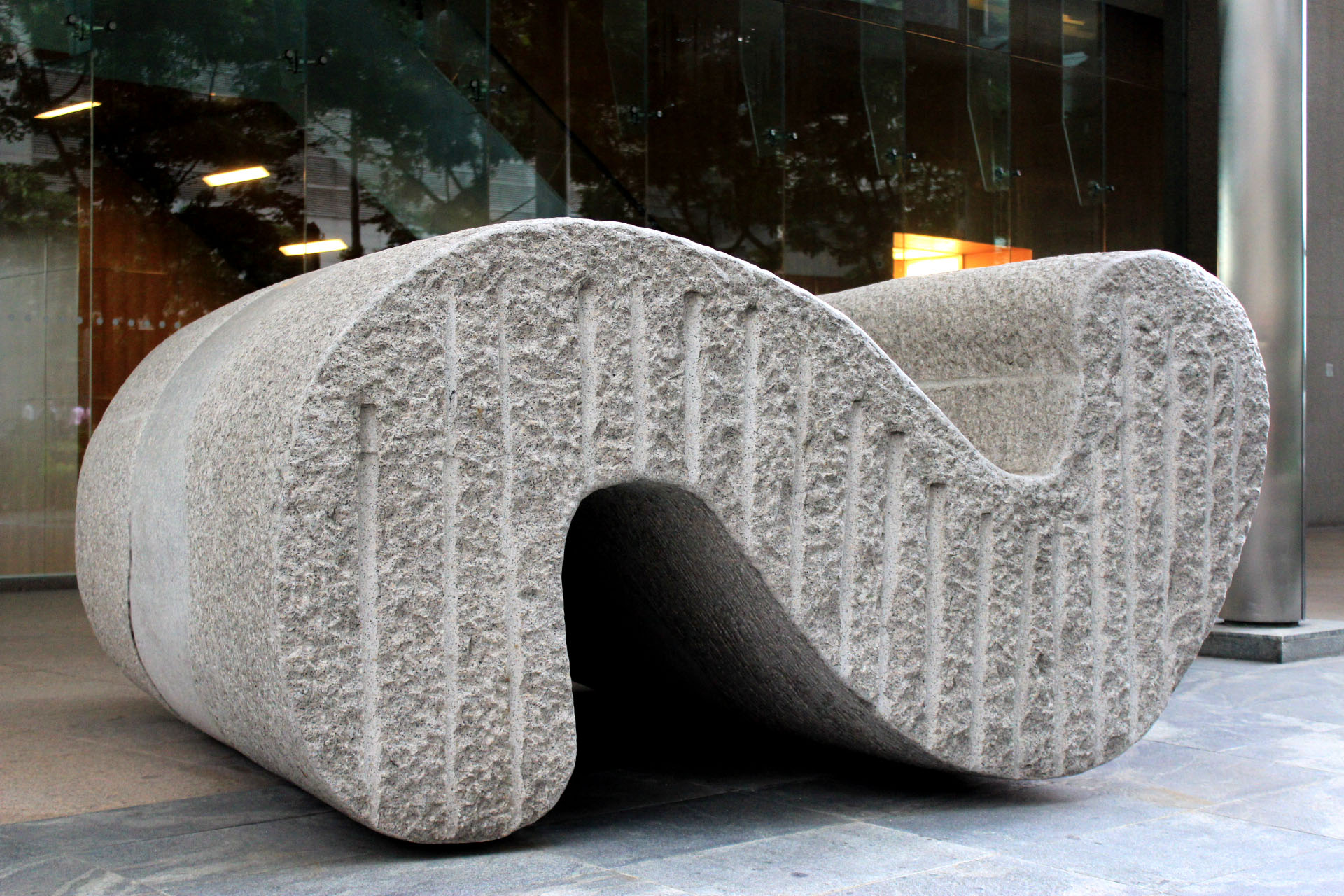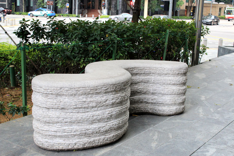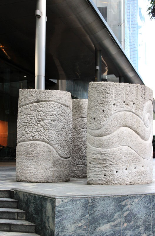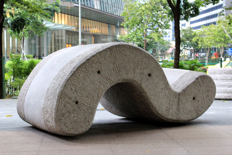 The sculpture “Progressive Flow” was cast on the ground outside One Marina Boulevard at the traffic junction between Raffles Quay and Marina Boulevard.