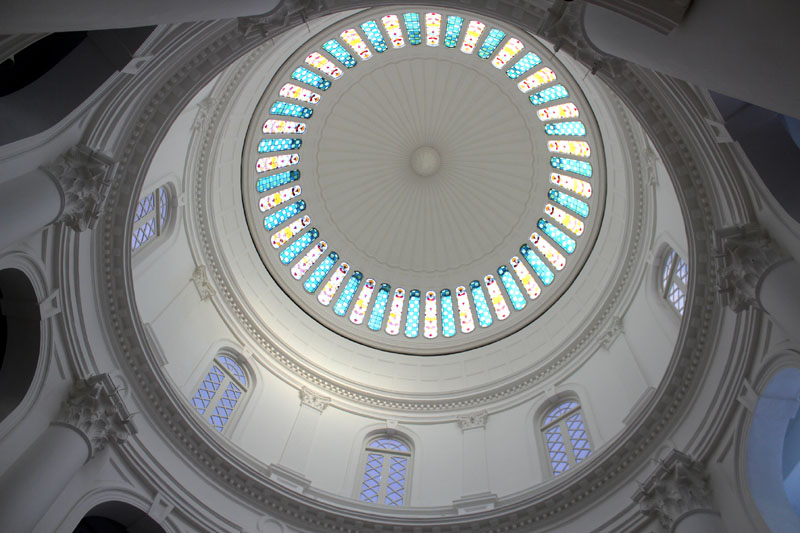 An interior look-up shot of a dome in National Museum of Singapore. Hear a sound of echoes from heavenly art.