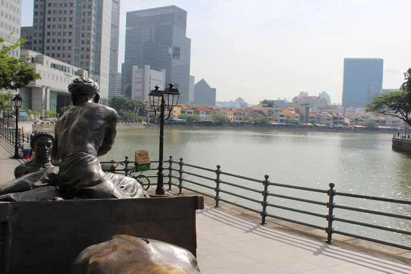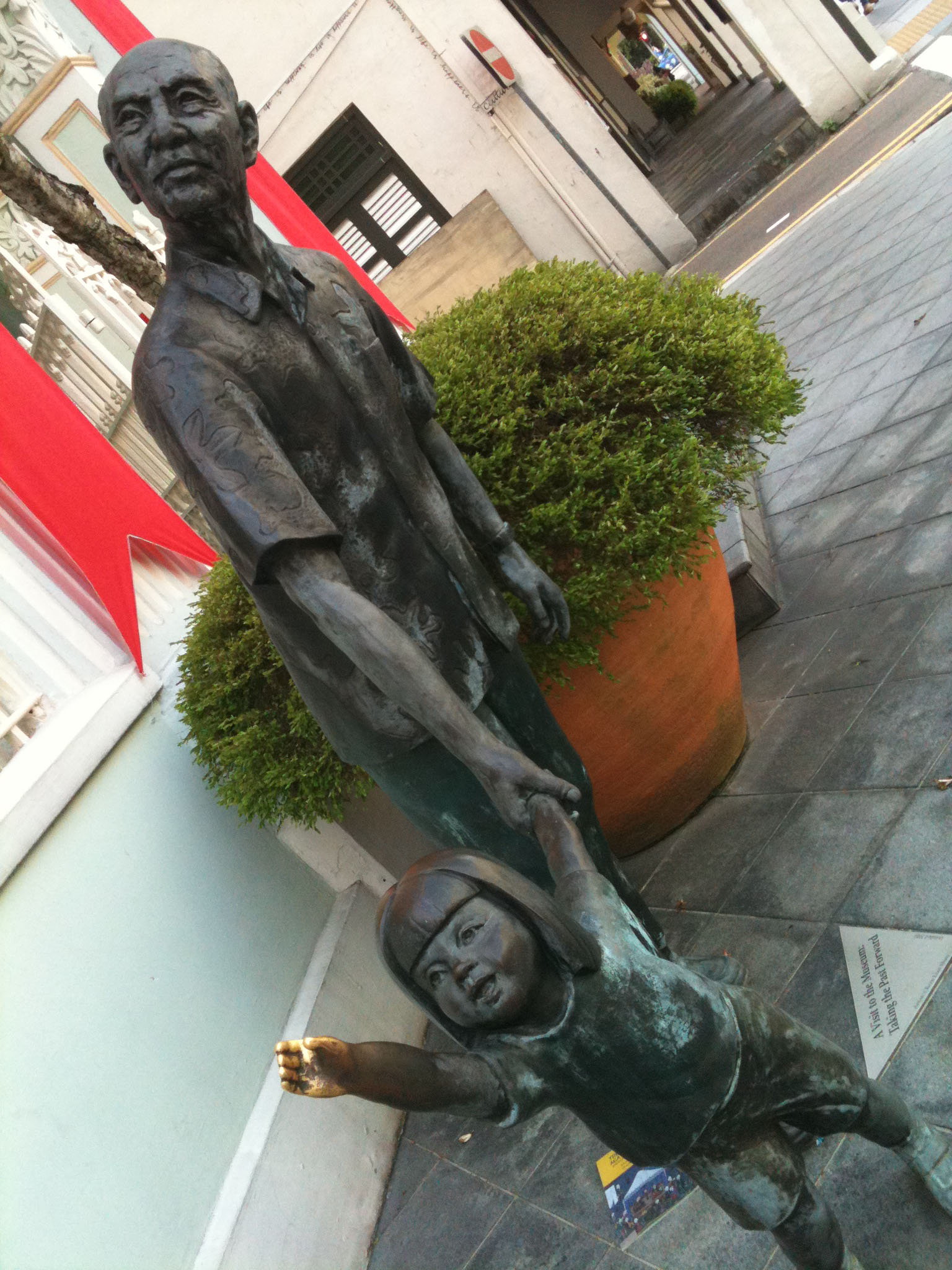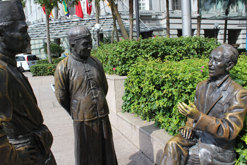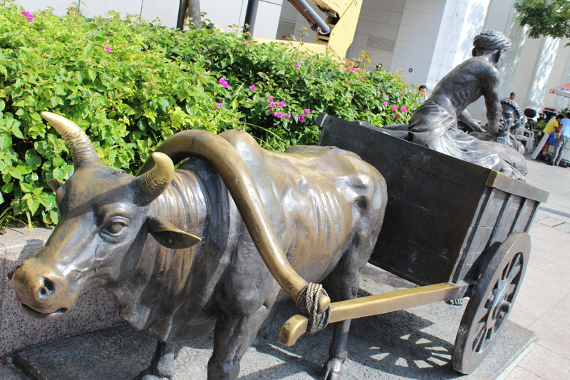 The sculpture shows he was mediating between Chinese trader and Malay chief while Indian and Chinese coolies load sacks onto a bullock cart.