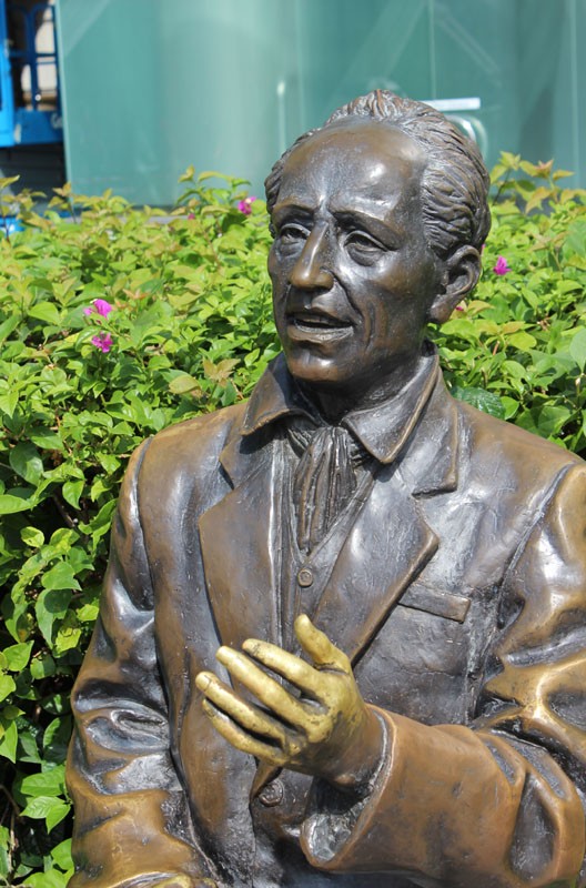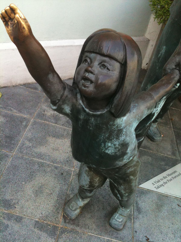 A grandfather and granddaughter’s sculpture located outside the main building.