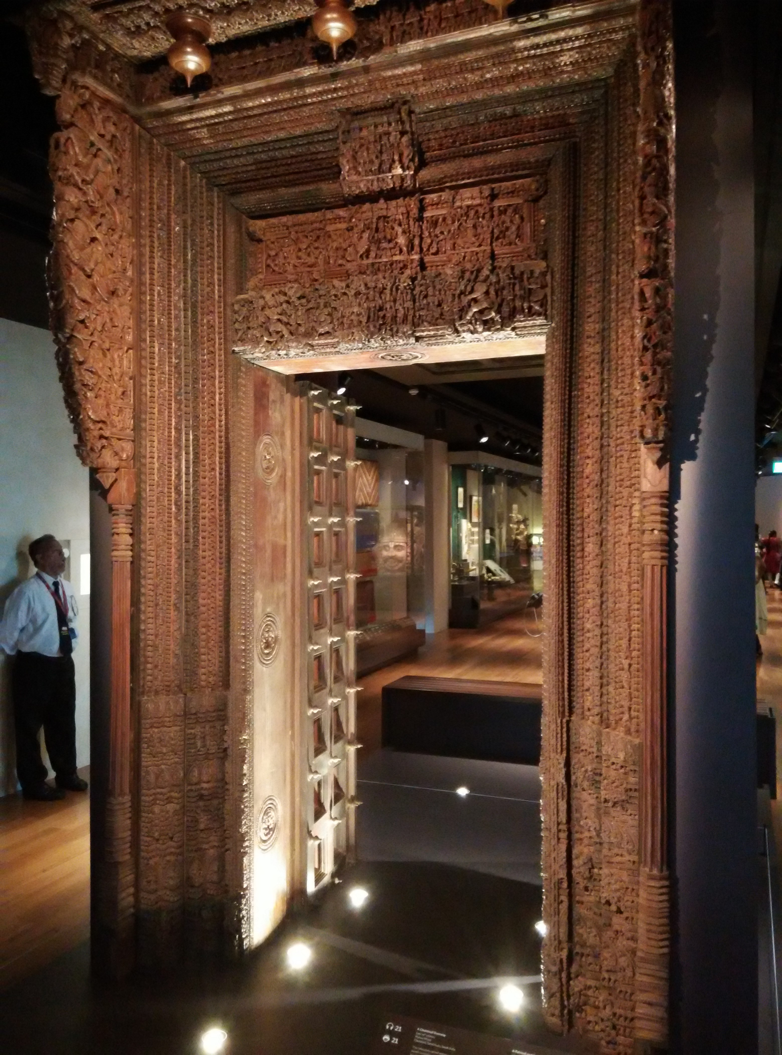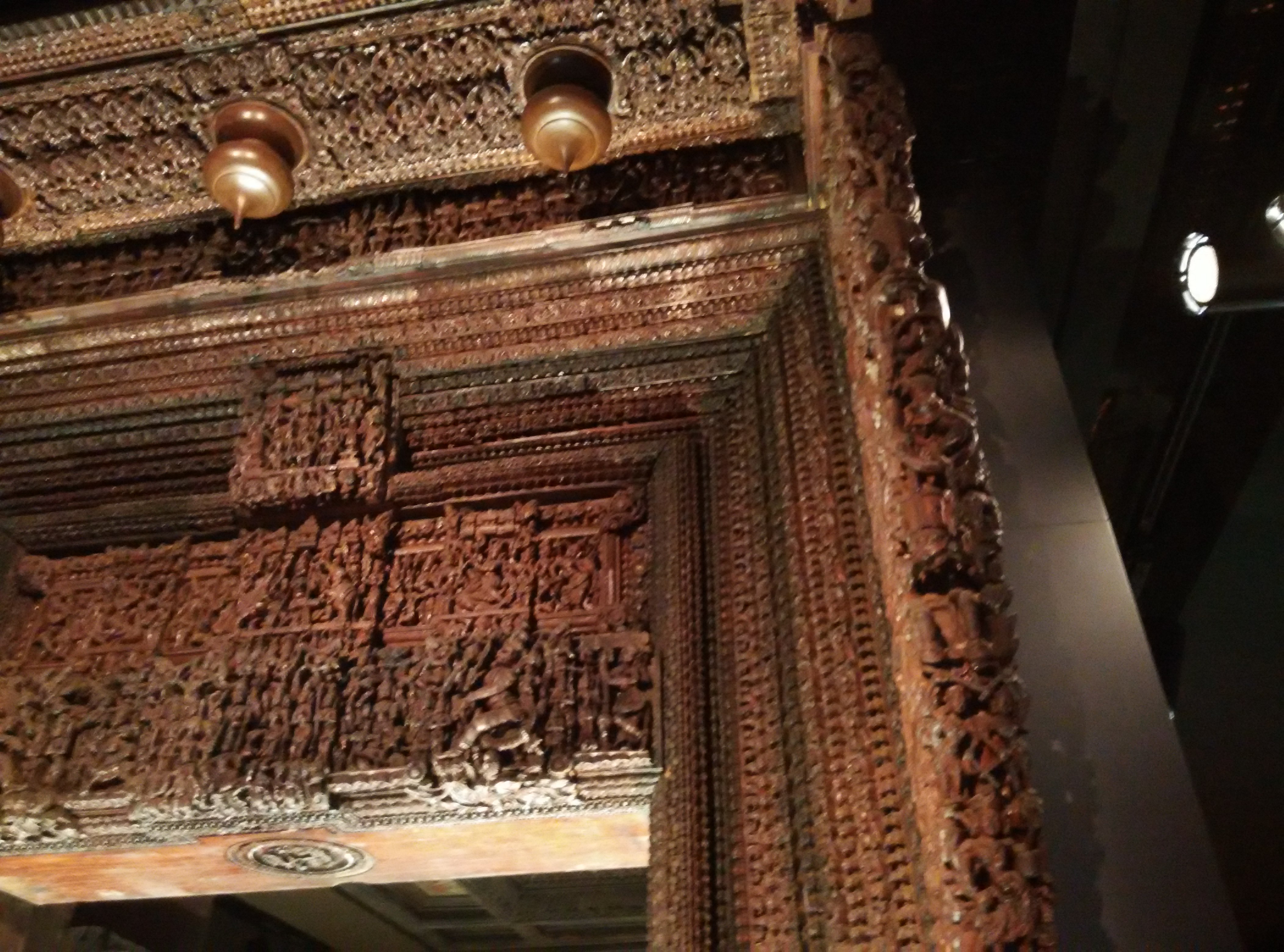 This intricately carved entrance doorway, with its jambs and lintel panels consisting of about 5000 minute carvings, it is a example of south Indian domestic architectural during the late 19th – early 20th centuries.It represents the bespoke architectural and woodcraving traditions of Chettinad, home to the Nattukotti Nagarthar Chettiar community of financiers and traders.