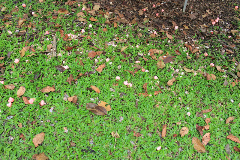 I spotted a Eugenia Jumbos tree near Eco Garden in Singapore Botanic Gardens. The floor are lying full of ripen fruits. It looks like a dropping bell at a glance.