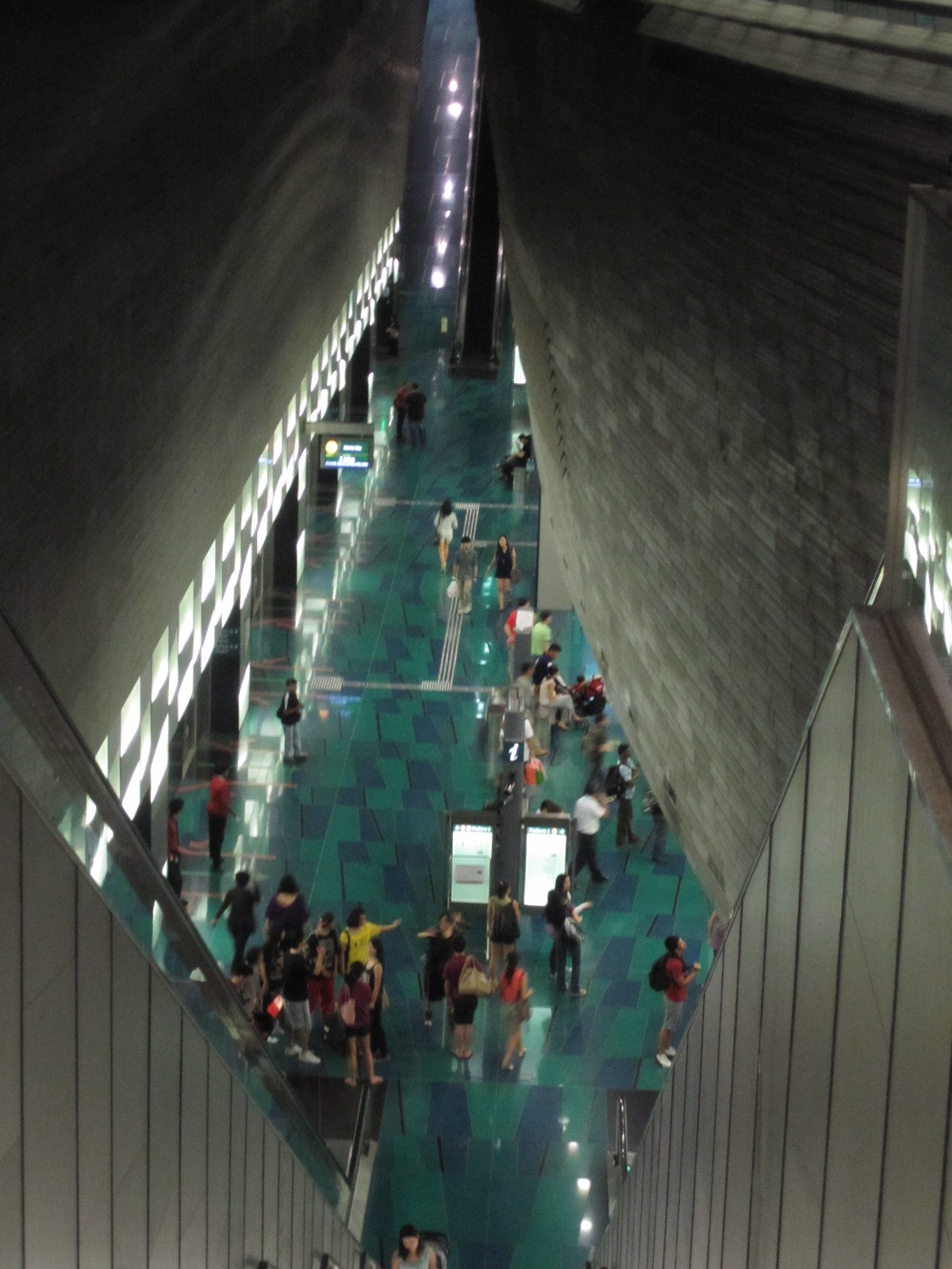 In my opinion, the interior of Stadium looks like a ship, cladded with gray tiles, side windows and a central skylight allowing light penetration. It also provides an oceanic view with vibrant turqoise colors as you slide from the top of the escalators to the basement platform.